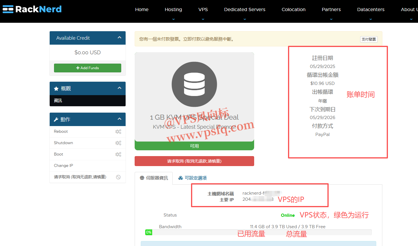 6、购买完成后,打开 RackNerd客户中心 就能看到自己的IP、流量等信息,包括后面翻倍信息也是在这里查看。