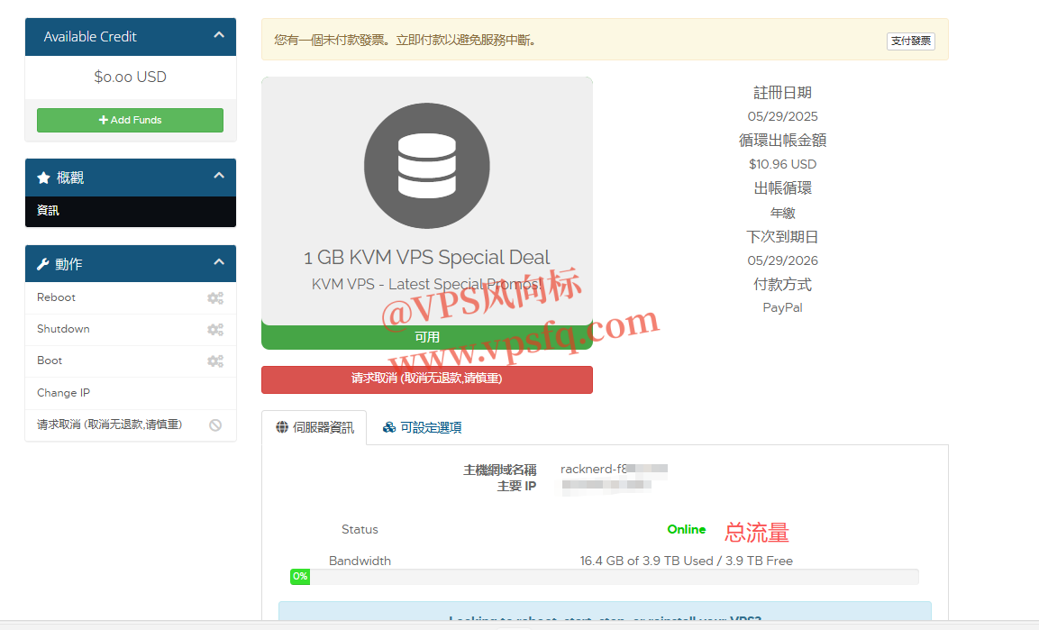 收到上方信息后,登录 RackNerd官网 ,点击自己的IP,在最下方可以看到流量已经翻倍,此流量是永久翻倍
